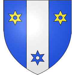 Blason – Tiercé en pal d’azur, d’argent en d’azur, à trois molettes, deux d’or en chef chargeant l’azur, une d’azur en pointe chargeant l’argent.